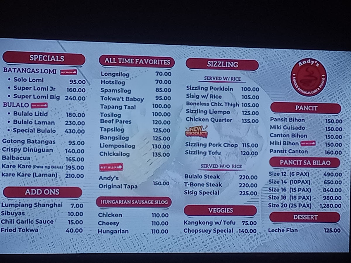 “ The closest lomi batangas to me and I feel so lucky. Their special lomi junior was good enough for two. Also ordered their sizzling liempo and it didn’t disappoint as well. We dined at night and it wasn’t humid at all. A lot of people eat here because it’s close to the main road, perfect for quick stops. Service was fast and crew was responsive. We paid around 260 pesos but we were so full already. Even though years have passed their price minimally increased, which is why I’ll always roof for Andy’s. Will try bulalo next! ”